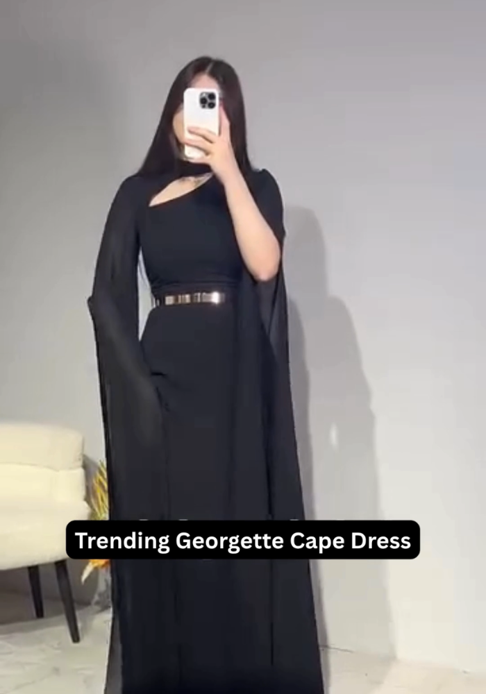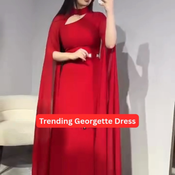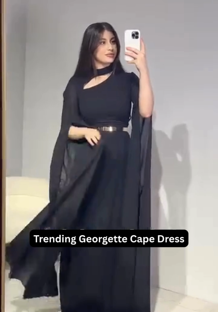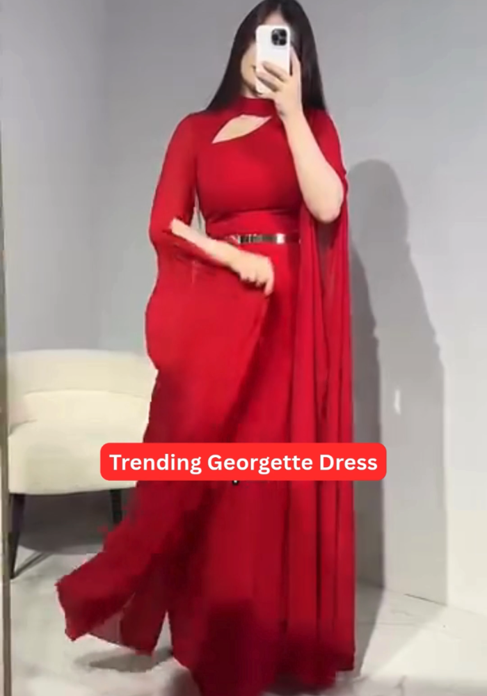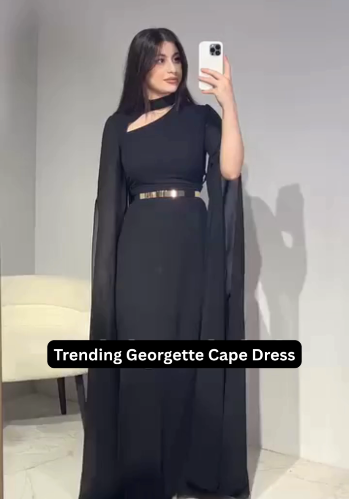 A striking georgette cape dress with an asymmetric keyhole neckline and collar. Comes with flowy cape sleeves and a sleek golden belt to accentuate your waist. Available in Red and Black .
