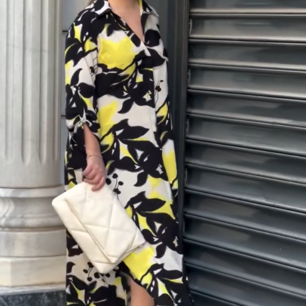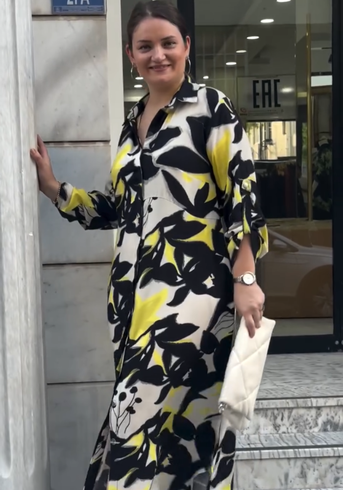 🌸 The bold abstract floral print in black and yellow hues adds a contemporary touch to its chic silhouette.